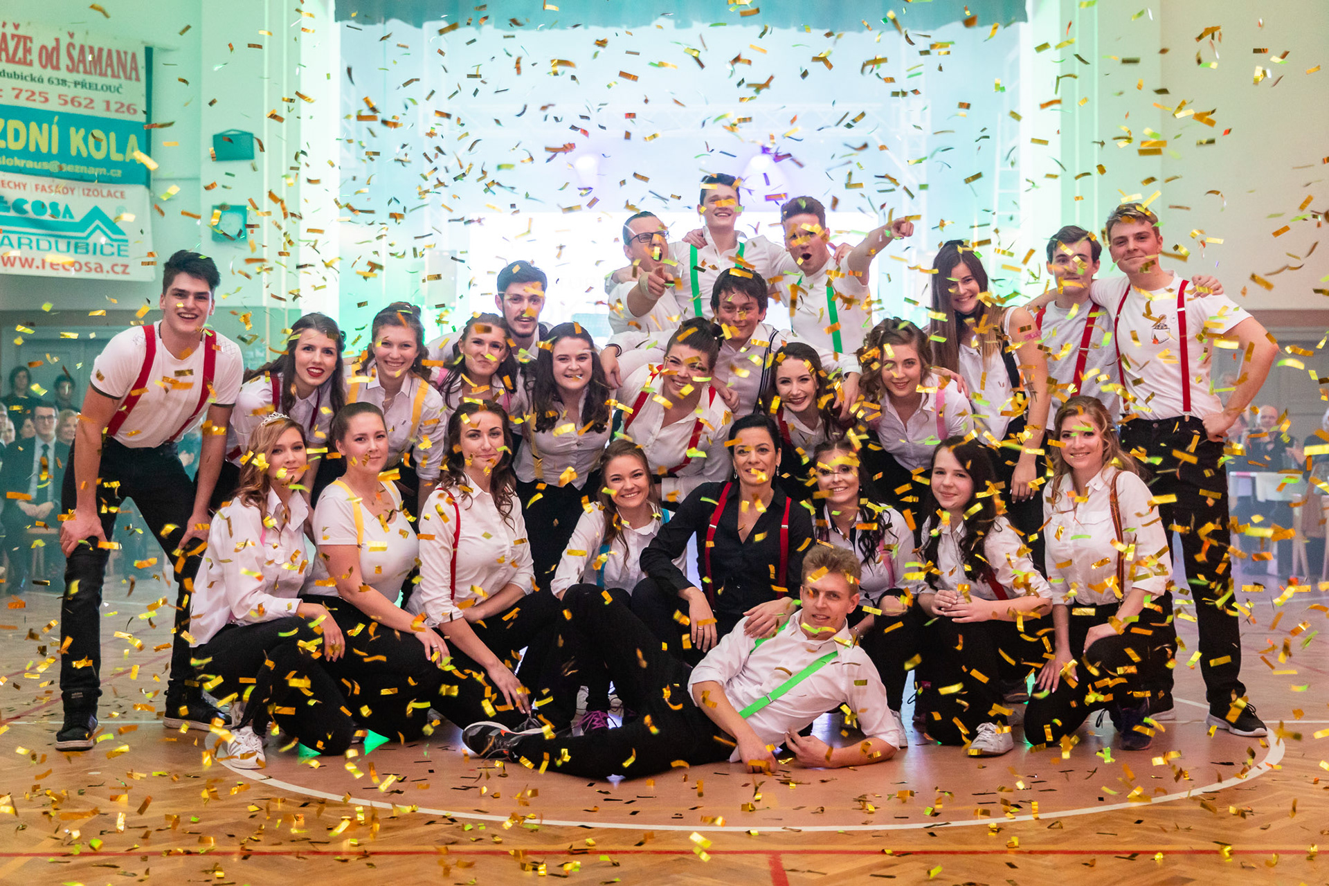 V Přelouči jsem chodil na střední školu a tak vím, že jsou zde pouze dva sály určené pro pořádání společenských akcí. Poměrně reprezentativní Záložna, kde je však pro takovéto plesy malý sál. Pak je zde Sokolovna, která je kapacitně dostačující, ale již pamatuje lepší doby. Zajímavostí je to, že její osvětlení hraje při každém stisku spouště jinými barvami, což je pro fotografa hotové utrpení, když chce, aby fotky byly barevně sjednocené.