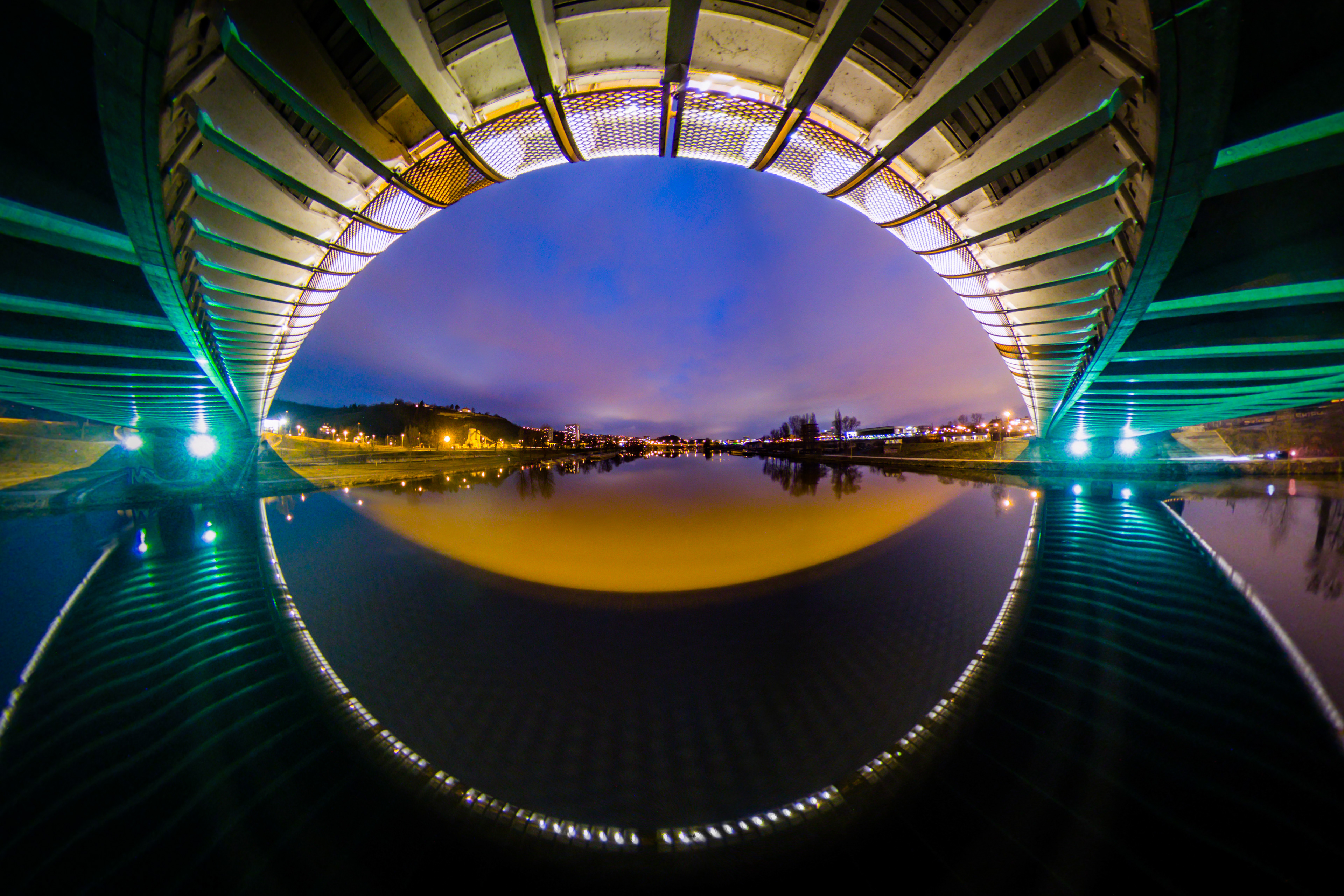 Mým nápadem bylo vyfotit panorama mostu z pod jeho oblouku. Je třeba si umět tu fotku vizualizovat a vymyslet technické provedení. První myšlenka byla jednoduše spustit kameru na laně, ale problém je vítr, který fouká nad řekou. Muselo by se počkat na 100% bezvětří, ale to je vcelku loterie. Zvolil jsem tedy dlouhou tyč a její ukotvení k zábradlí, kamera tak byla pevně fixována.